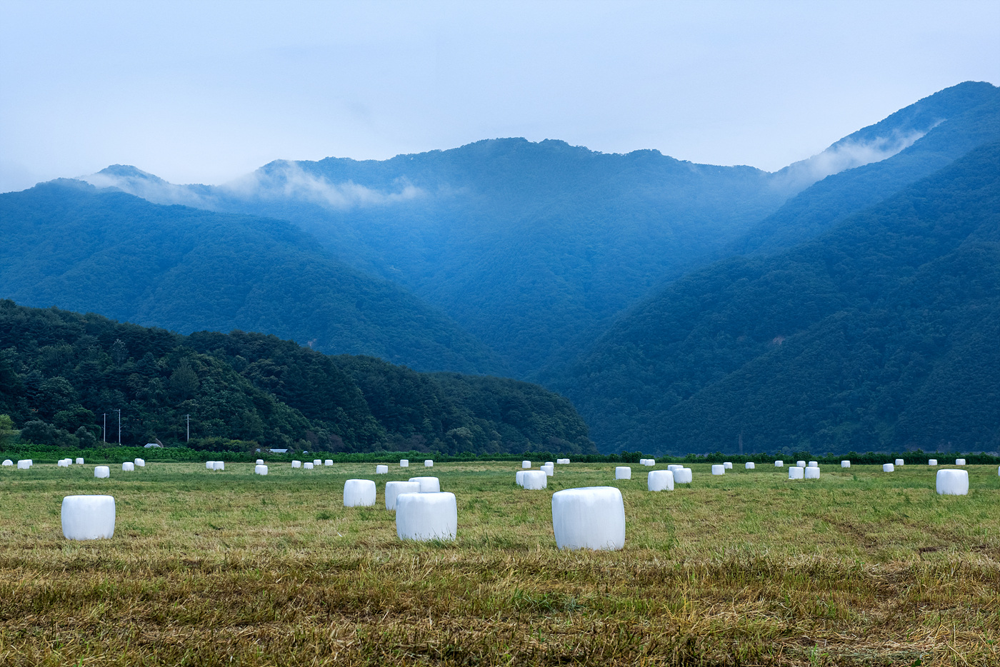 The beautiful bales ensilage wrapped in whte polyethylene in the green field.